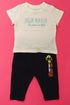 Legging taille élastique avec liens de serrage, revers aux chevilles, tee-shirt manches courtes, pressions à l'épaule, sérigraphie.