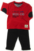 Pantalon, taille élastique avec liens de serrage, 2 poches, revers, tee-shirt manches longues, pressions à l'épaule, coudières, broderie.