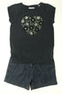 Short en jean, taille ajustable, fermeture éclair et bouton, 4 poches, tee-shirt manches courtes, sérigraphie, sequins, fleurs en mousseline.
