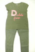 Pantalon fluide, taille ajustable, fermeture éclair et crochet, 2 poches, tee-shirt manches courtes à revers, sérigraphie.