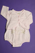 Gilet 2 boutons, barboteuse à fines bretelles, sérigraphie dorée, pressions dans le dos et à l'entrejambe.