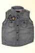 Col plat, sans manches, fermée par pressions, 2 poches poitrine, écusson, effet vieilli d'origine.