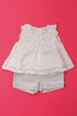 Blouse doublée, à pois, sans manches, entièrement boutonnée dans le dos, volants, short, taille réglable boutonnée, 2 poches, revers volantés aux cuisses.