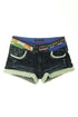 Braguette avec pressions et fermeture éclair, 5 poches, cuisses et poches ornées de moumoutte, rubans appliqués.