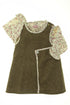 Robe en laine, doublée, sans manches, pans croisés boutonnés, bretelles boutonnées, blouse, col pierrot, entièrement boutonnée dans le dos, élastiques aux poignets, à signaler que la blouse ne fait pas très nette.