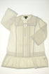 Col boutonné, plis plats, rubans crochetés.