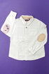 Col plat, poche poitrine, coudières, poignets boutonnés.