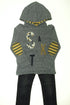 Jean, taille ajustable, fermeture éclair et crochet, 5 poches rivetées, écussons, coupe slim, tee-shirt manches longues, capuche doublée, sérigraphie, coudières.