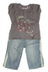 Jean effet usé, taille élastique, rubans de broderie anglaise, 3 poches, tee-shirt, col tunisien boutonné, sérigraphie, broderie.