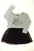 Robe sans manches, taille élastique, bas en tulle doublé avec motifs en velours, sweat marinière cropped, sérigraphie.