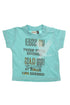 Tee-shirt à manches courtes, col rond bord-côte fermé par pressions à l'épaule, inscriptions inversées sérigraphiées et brodées, tâche blanche (aigle?) faisant partie du motif.