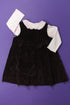 Robe en velours ras, sans manches, entièrement boutonnée dans le dos, nœud appliqué, body manches longues, pressions dans le dos et à l'entrejambe, col claudine.
