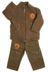 Ensemble composé d'un pantalon en toile, taille élastique, 2 poches rivetées sur les côtés, 2 à rabat à pressions aux genoux, 2 fausses derrière, d'un sweat léger zippé, col rond, 2 poches ne L, écusson, poignets et taille resserrés et d'un tee-shirt à manches longues, col rond boutonné à l'épaule, poignets gansés, sérigraphie effet vieilli d'origine, bouton de courtoisie. Cet ensemble 3 pièces est idéal en mi-saison.