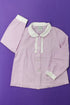 Col claudine gansé, poignets boutonnés, plis plats et froufrous au plastron.
