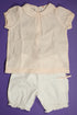 Taille élastique, chevilles ajourées et volantées, blouse col claudine, entièrement boutonnée dans le dos, légère, finitions ajourées.