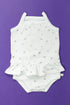 Fines bretelles, pressions à l'entrejambe, sérigraphie, volants.