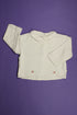 Doublé, ajouré, col claudine, entièrement fermé par pressions dans le dos.
