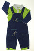 Salopette doublée, bretelles réglables par pressions, pressions à l'entrejambe, 4 poches, revers aux chevilles, broderie, tee-shirt manches longues, fermé par boutons et pressions masquées, col plat, sérigraphie, effet trompe l'œil.