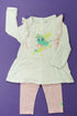 Tee-shirt manches longues, entièrement fermé par pressions dans le dos, sérigraphie, volanté aux épaules, élastique aux poignets, legging assorti, taille élastique.