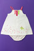Robe à fines bretelles, entièrement fermée par pressions dans le dos, sérigraphie, bloomer assorti, taille et cuisse élastiques.