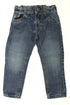Taille ajustable, fermeture éclair et pression, 5 poches rivetées, effet vieilli d'origine.