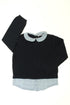 Effet de superposition, col claudine boutonné dans le cou, poignets resserrés.