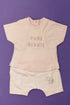 Tee-shirt manches courtes, entièrement fermé par pressions dans le dos, short, taille élastique, sérigraphie.