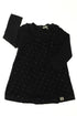 Superposition de 2 robes, une unie manches longues, une sérigraphiée sans manches, entièrement fermées par pressions dans le dos.