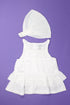 Doublée, fines bretelles, boutonnée dans le dos, volants en broderie anglaise, fichu assorti, élastique dans la nuque.
