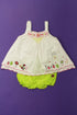 Robe effet tablier, fines bretelles, entièrement boutonnée dans le dos, sérigraphie, bloomer, taille et cuisses élastiques.