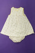 Sans manches, entièrement boutonnée dans le dos, liseré, bloomer, taille et cuisses élastiques.