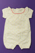 Barboteuse doublée, pressions masquées à l'entrejambe, boutonnée dans le dos, plumetis, cuisses élastiques, tee-shirt manches courtes, entièrement fermé par pressions dans le dos, sérigraphie.