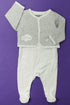 Dors-bien en coton, pressions aux épaules et à l'entrejambe, sérigraphie, brassière doublée, fermée par pressions, sérigraphie.