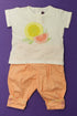 Pantalon, taille réglable fermée par pression, 2 poches, pressions aux chevilles, tee-shirt manches courtes à revers, sérigraphie, pressions dans le dos.