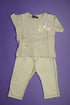 Ensemble composé d'un pantalon léger, taille élastique fermée avec bouton décoratif, 2 poches sur les côtés, 2 plaquée derrière, coutures apparentes et d'un tee-shirt à manches courtes, col rond bords-côtes boutonné à l'épaule, écussons sérigraphiés, magnifique!