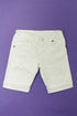 Taille ajustable, fermeture éclair et bouton, 5 poches, revers aux cuisses, empiècements.