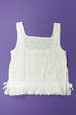 Sans manches, larges fentes sur les côtés, ajouré, broderie anglaise au bas.