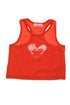 Débardeur avec épaules dégagées, caméléons sérigraphiés en forme de cœurs, nœud de satin appliqué, "Cacharel" brodé, comme neuf!