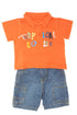 Bermuda, taille réglable fermée par pressions, 5 poches, polo manches courtes, col plat, sérigraphie et broderie.