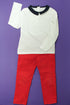 Jean de couleur, taille ajustable, fermeture éclair et bouton, 5 poches, tee-shirt manches longues, col plat boutonné dans le cou.