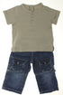 Jean, taille réglable, braguette à pressions, 4 poches, jambes retroussables, effet vieilli d'origine, tee-shirt manches courtes, entièrement fermé par pressions dans le dos, col tunisien boutonné, revers aux manches.