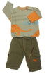 Ensemble composé d'un pantalon doublé, taille élastique, passants en gros grain, nombreuses poches en biais avec ou sans rabat, écusson crocodile orange, broderie "Les animaux sauvages", jolies coutures et d'un tee-shirt à manches longues, col rond rayé, pressions à l'épaule, arrière d'un dinosaure, le devant se trouve dans le dos, "croco" appliqué, une manche bicolore, ensemble vraiment rigolo, le tee-shirt est un peu feutré!