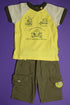 Ensemble composé d'un pantalon, taille élastique, 2 poches sur les côtés, 2 à rabat boutonné aux cuisses, écusson et d'un tee-shirt à manches courtes, col en V fermé par pressions à l'emmanchure, manches resserrées, sérigraphie, super rigolo!