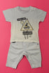 Pantalon, taille élastique, 5 poches, tee-shirt manches courtes, pressions à l'épaule, sérigraphie.