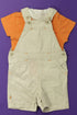 Salopette courte, bretelles réglables boutonnées, 3 poches, pressions masquées à l'entrejambe, tee-shirt manches courtes, pressions à l'épaule, poche poitrine, col trompe l'œil.