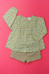 Short, doublé, taille réglable fermée par pression, 2 poches, revers aux cuisses, blouse manches longues, entièrement fermée par pressions dans le dos, poignets élastiques, plis plats.