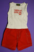 Ensemble composé d'un short, taille élastique, 1 poche à rabat sur le côté, 1 plaquée derrière, coutures apparentes et d'un débardeur, col rond et emmanchures gansées, sérigraphie effet vieilli d'origine, magnifique!