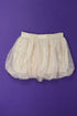 Doublée, taille élastique, tulle pailleté, coupe boule.