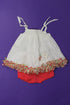 Fines bretelles, entièrement boutonnée dans le dos, franges, élastique au plastron, motifs appliqués, bloomer gaufré, taille et cuisses élastiques.