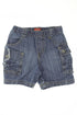 Taille élastique, 4 poches rivetées, poches effrangées.